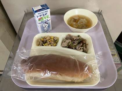 今日の給食は、黒糖パン、牛乳、豚肉のオイスターソース焼き、中華スープ、ツナとチンゲンサイのいためもの、です。