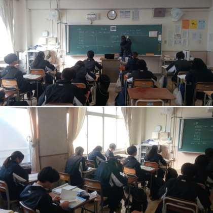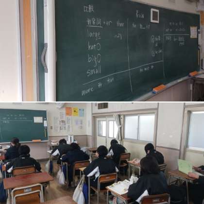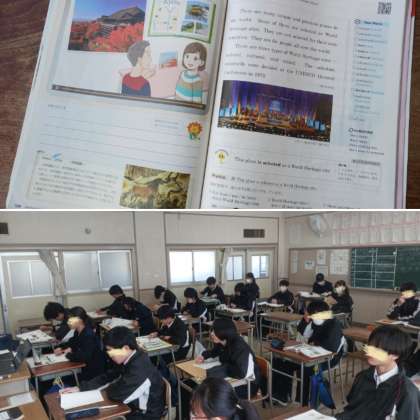 2年生の英語の授業では学年末テスト前の総復習が行われています。これまで学習してきた比較級、最上級、受動態の文法事項や過去文詞形の覚え方等、先生から説明がありました。今日はワークやノートを読みながら、これまでの既習事項の確認や質疑応答がありました。