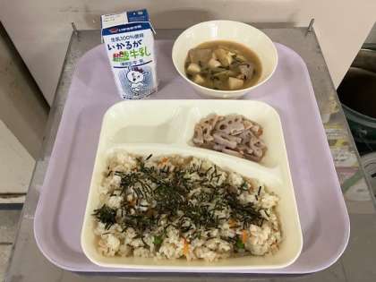 今日の給食は、鶏ごぼうご飯、きざみのり(袋・鶏ごぼうご飯)、牛乳、みそ汁、焼きれんこん、です。今日は3年生だけが給食を取ります。