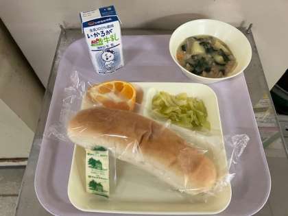 今日の給食は、コッペパン、ソフトマーガリン、牛乳、鶏肉とほうれん草のシチュー、キャベツのサラダ、デコポン、です。