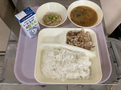 今日の給食は、ごはん、みそ汁、牛乳、豚肉のしょうが焼き、高野どうふの煮もの、です。