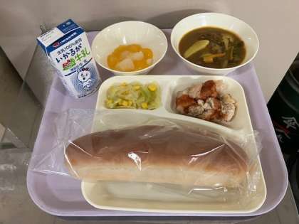 今日の給食は、黒糖パン、牛乳、あげどりのバーベキューソース、カレースープ、キャベツとコーンのサラダ、フルーツゼリー、です。