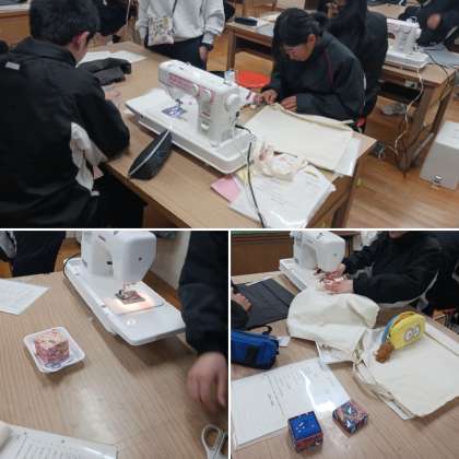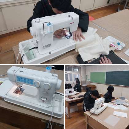 1年生の家庭科の授業では、ミシンの使い方について学んでいます。エコバッグを作っています。ミシンの扱いはコツがいりますが、つかんだらいろんな作品ができそうです。生徒同士で相談しあって、更に知識を深めています。
