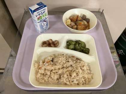 今日の給食は、かやくご飯、牛乳、関東煮、きゅうりの梅風味、とら豆の煮もの、です。