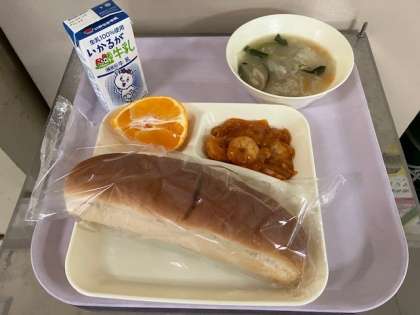 今日の給食は、黒糖パン、牛乳、えびのチリソースいため、中華がゆ、デコポン、です。