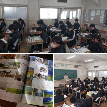 1年生の理科の授業では「大地の恵みと災害」の中で、海岸付近にみられる階段の地形である海岸段丘を学習しました。