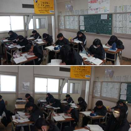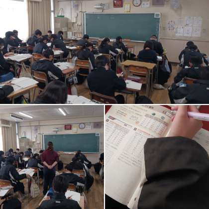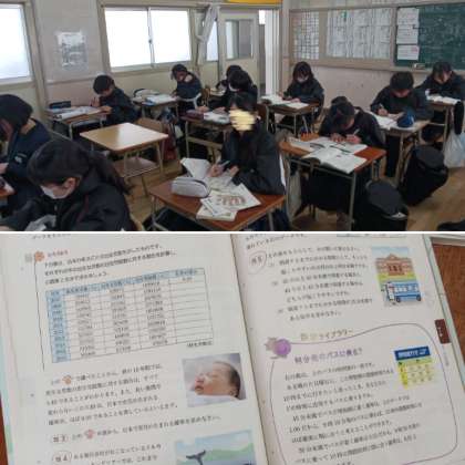 1年生の数学の授業では「確率」について学習しています。先生から解説を聞いて、練習問題に取り組んでいます。