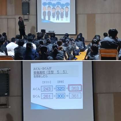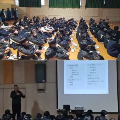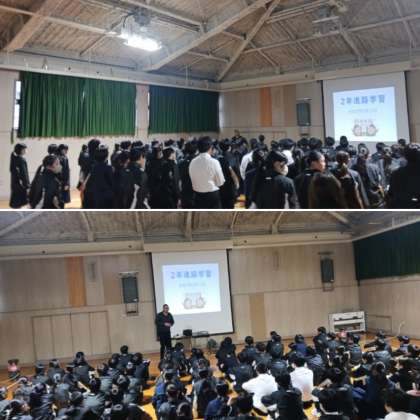 2年生の総合の授業にて、格技室で進路学習を行いました。進路指導主事の先生から高校の種類や受験に関するいろいろな説明がありました。まだわからないことも多いでしょうが、これから新学年に向けて、ちょっとずつ受験に関する事柄を覚えていきましょう。