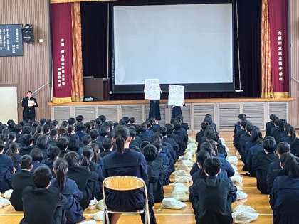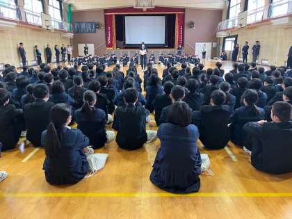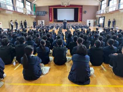 始業式の後、生徒会主催で対面式が行われました。1年生と2・3年生が会うのは初めてになります。生徒会代表から1年生を迎える挨拶があり、「自分たちがよいお手本になるように」との心構えも聞くことができました