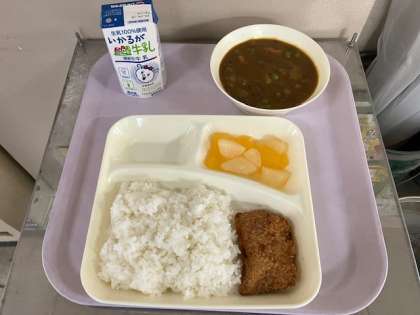 今日の給食は、カツカレーライス、牛乳、フルーツゼリー、です。今日の献立は「入学祝い献立」です。1年生のみなさんが中学生になったお祝いの献立です。2年生、3年生のみなさんも1年生の入学と自分たちの進級を一緒にお祝いしましょう。