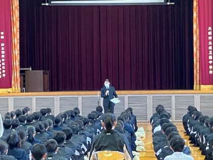 毎週月曜日は全校集会を行います。8時25分には全学年集合しました。生徒会が中心となり、声出しなどを行い、全校集会は始まります。