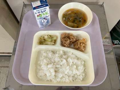 今日の給食は、ごはん、牛乳、鶏肉のたつたあげ、五目汁、キャベツの梅風味、です。