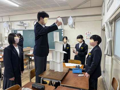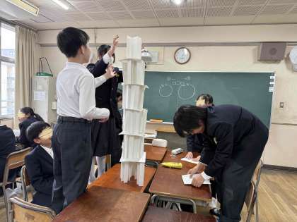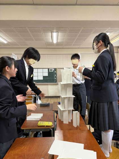 1年生の学活の様子です。「アイスブレイク」を行っています。紙を利用して、グループ内で協力し合って、どれだけ高く積み上げることができるか、競っています。今まで違った小学校やクラスで、今年度初めて同じクラスになって、協力し合っています。