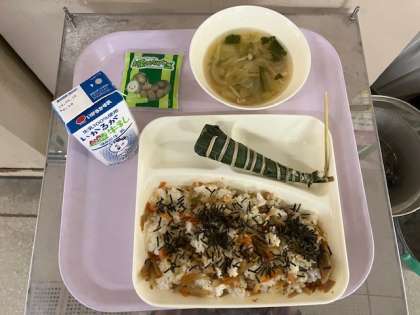 今日の給食は、きんぴらちらし(具)、きざみのり(きんぴらちらしにかける)、牛乳、五目汁、ちまき、まっ茶大豆、です。