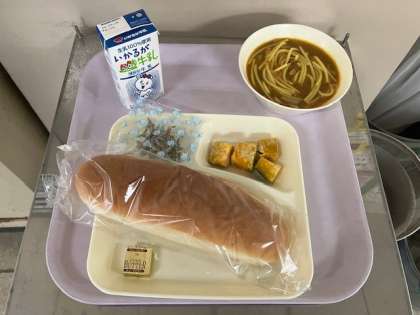 今日の給食は、コッペパン、バター、牛乳、カレースパゲッティ、かぼちゃのマリネ焼き、ミニフィッシュ、です。