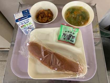 今日の給食は、黒糖パン、牛乳、レタスのスープ、じゃがいものミートグラタン、ソフト黒豆、です。