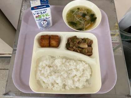 今日の給食は、ごはん、中華スープ、牛乳、ホイコウロー、あつあげのピリ辛じょうゆかけ、です。