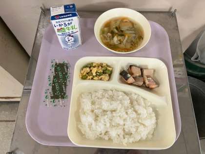 今日の給食は、ごはん、牛乳、焼きのり、さけのみそ焼き、五目汁、えんどうの卵とじ、です。