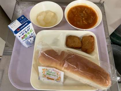 今日の給食は、コッペパン、アプリコットジャム、牛乳、とんかつ、ミネストローネ、和なし(カット缶)、です。