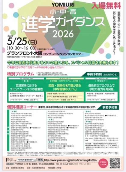5月25日(日)10:30〜16:00にグランフロント大阪北館B2Fコングレコンベンションセンターにて「YOMIURI小中高進学ガイダンス2026」が開催されますのでご連絡いたします。参加を希望される方は、QRコードを読み取って事前予約をお願いいたします。