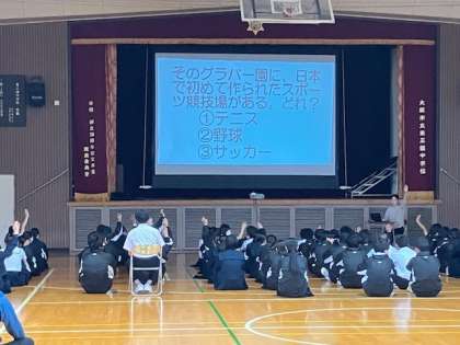 来週の5月13日(火)から15日(木)に3年生63期生は長崎方面へ修学旅行へ行きます。今日の3年生の学年集会では、学年の先生から長崎にまつわるクイズが出題されました。「あぁ、そうやったのか。」という内容の問題がありました。