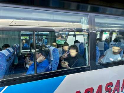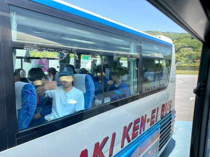 今日のお昼の様子です。バス内で昼食を食べました。しっかり食べて、ペーロンに備えます。