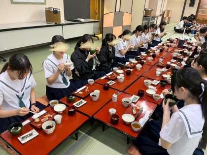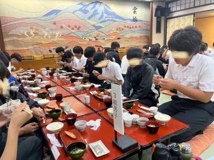 修学旅行2日目を迎えました。朝食の様子です。食事係の挨拶、また宿舎の方にもお礼を伝えました。今日の取組にも備えて、しっかり食べましょう。