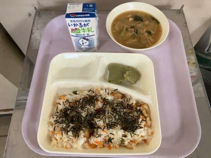 今日の給食は、かやくご飯、きざみのり、みそ汁、牛乳、まっ茶ういろう、です。