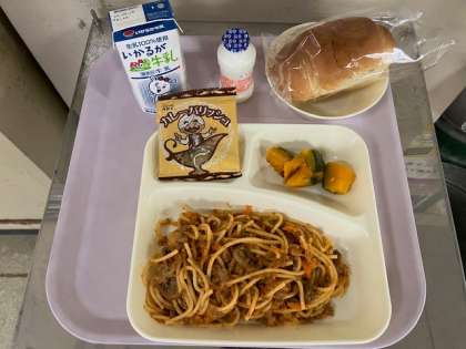 今日の給食は、ミニコッペパン、牛乳、ミートソーススパゲッティ、焼きかぼちゃ、カレーフィッシュ、発酵乳、です。