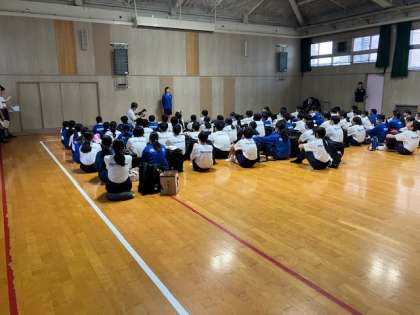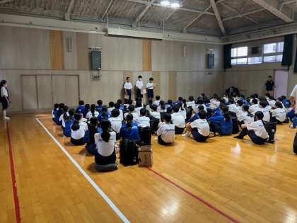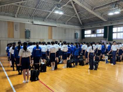 65期生一年生の一泊移住が始まります。格技室で代表生徒の司会で出発式が行われました。教頭先生の挨拶、代表生徒の決意表明がありました。いよいよ出発です。