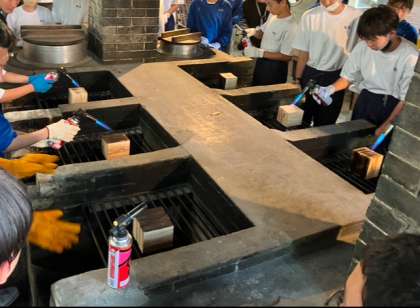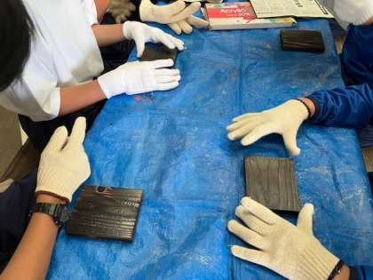 一泊移住、焼杉制作の様子です。一人一枚ずつ制作していく杉の板をバーナーで炙ってします。それを新聞紙で磨いてテカリを出します。