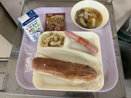 今日の給食は、レーズンパン、牛乳、ウインナーのケチャップソース、スープ、焼きツナキャベツ、おさつチップス、です。