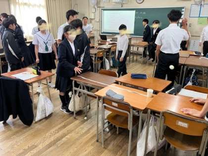 体育館では、1〜3年生でグループを作りました。(たてわり班)生徒会のグループの発表を聞いて、各教室へ移動しました。教室ではグループ内で班長を決め、自己紹介を行いました。名前でなく、ニックネームで呼び合うことでフランクな雰囲気を作ります。しかし、特に1年生は初めて話す先輩も多いので、ピンポン玉を紙コップに入れるゲームで緊張を解きました。(アイスブレイキング)