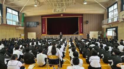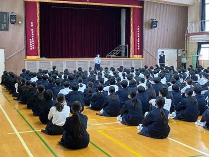 今日の全校集会の様子です。8時23分には集合完了していました。とてもいい感じでした。