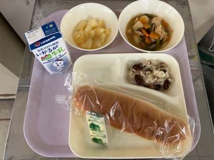 今日の給食は、コッペパン、牛乳、金時豆の中華おこわ、まる天と野菜のうま煮、パインアップル(カット缶)、ソフトマーガリン、です。