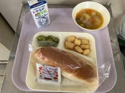 今日の給食は、コッペパン、いちごジャム、牛乳、いかてんぷら、フレッシュトマトのスープ煮、きゅうりのバジル風味サラダ、です。