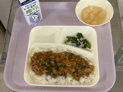 今日の給食は、和風カレー丼、牛乳、オクラの甘酢あえ、和なし(カット缶)です。