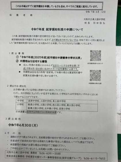 令和7年度就学援助制度の申請につきまして(6月12日(木))