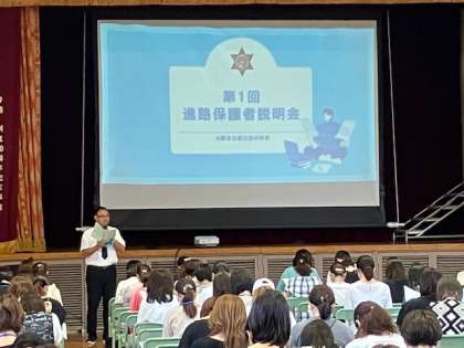 本日、授業参観が終わってから、15時30分より第1回進路保護者説明会が行われました。3年生の保護者対象でしたが、1・2年生の保護者の方もたくさん来られました。本日は公立と私立の違いからスケジュールなど話をしました。1時間の予定が、少し伸びてしましましたが、みなさん熱心に聞いておられました。