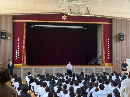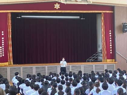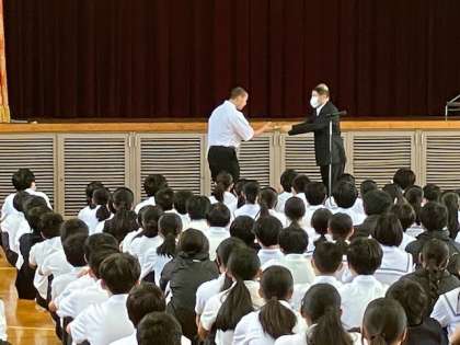 今日の全校集会の様子です。集会に先駆けて、大阪市中学校春季総合体育大会相撲競技の部に参加した生徒の表彰がありました。雨の中、よく頑張りました。