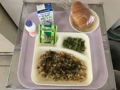 今日の給食は、ミニコッペパン、牛乳、和風焼きそば、きざみのり(袋・和風焼きそば)、オクラのかつお梅風味、まっ茶大豆、発酵乳、です。