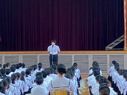 生活指導主事の先生:自分が失敗した時、自分を見つめなおしていますか?失敗の原因を他人のせいにしていませんか?失敗は誰にでもあるので、反省して次の行動ができたらいい。また、周りの人もはやし立てることのないように。