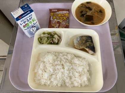 今日の給食は、ごはん、みそ汁、牛乳、さごしのおろしじょうゆかけ、野菜いため、おさつチップス、です。