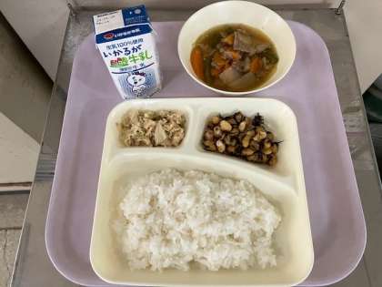 今日の給食は、ごはん、牛乳、豚肉と野菜の煮もの、ひじき豆、ささみとキャベツのごまみそ焼き、です。