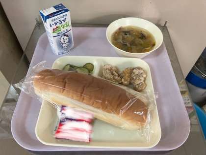 今日の給食は、コッペパン、牛乳、鶏肉のからあげ、ハムととうがんの中華スープ、