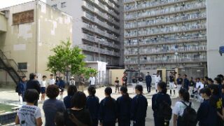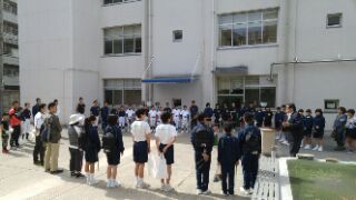 8:45 中学校東門には生徒40人、保護者・地域9人、教職