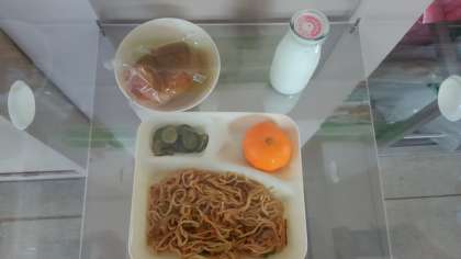 新東三国小学校で作られたおかず、週に2回のパン食。