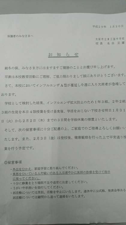 昨日から2年2組、3組、1年3組が3日間、学級休業に