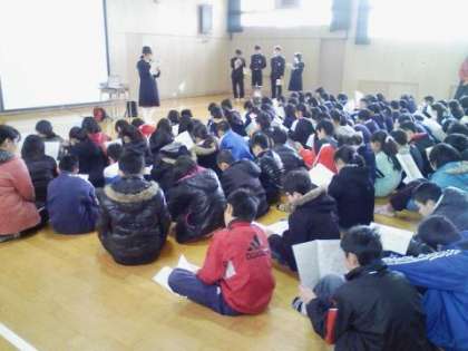 小中一貫した教育のひとつとして、東三国小学校と新東三国小学校の6年生を中学校に招き、「小中交流交歓会」がおこなわれました。