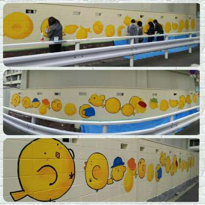 地下鉄、東三国駅から学校へ来た壁にヒガッピーが